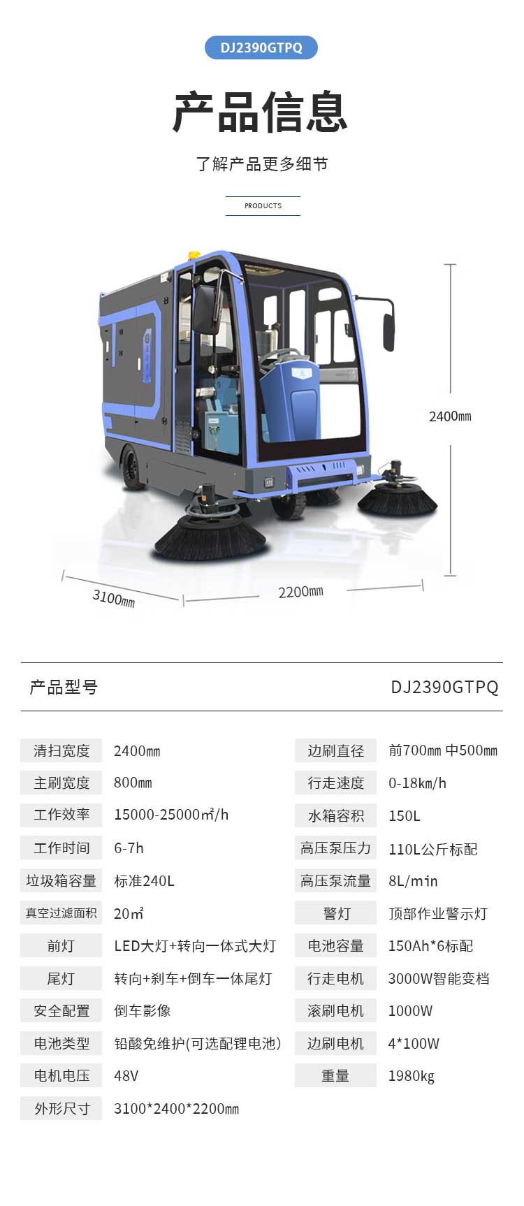 適用場所:配備倒車影像、液晶顯示屏、水箱報警器、整車烤漆工藝、驅(qū)動電機(jī)3000W爬坡能力更強(qiáng)。