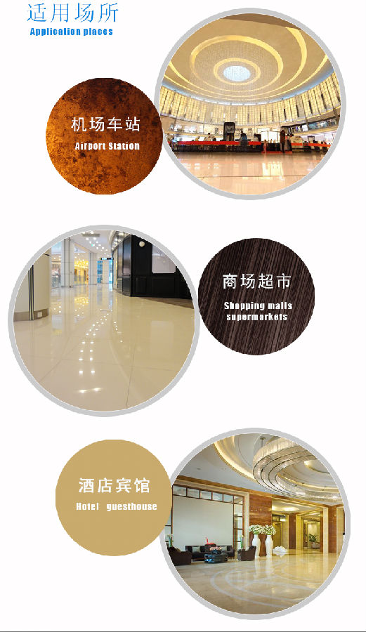 適用場所:針對賓館、酒店、大廈商場、機場超市等高檔場所的天然石材(大理石、花崗巖)打磨翻新晶面處理,是再造石材靚麗光亮的工具