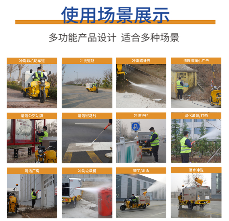 適用場(chǎng)所:適用場(chǎng)所:能有效清除建筑物,地面灰塵、污漬、可更高效的清洗環(huán)衛(wèi)站、公交車、工程車輛等,可實(shí)現(xiàn)一機(jī)多用,是城市保潔、環(huán)衛(wèi)、建筑工礦企業(yè)理想的性價(jià)比最高的戶外沖洗產(chǎn)品。